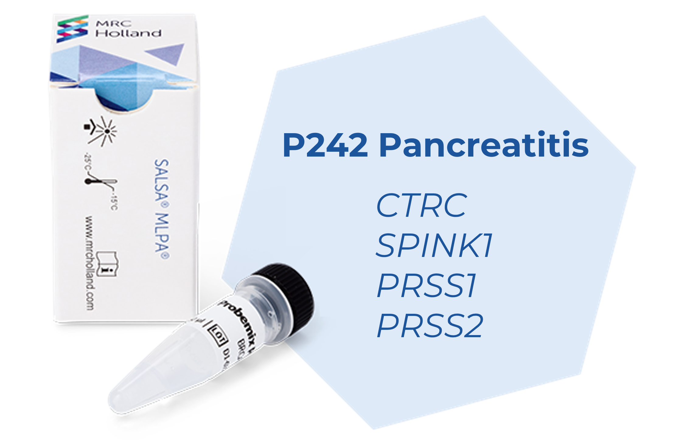 SALSA® MLPA® Probemix P242 Pancreatitis is an assay for the detection of deletions, duplications or genomic rearrangements in the CTRC, SPINK1, PRSS1 and PRSS2 genes, which are associated with hereditary pancreatitis. This probemix now also detects the presence of the SPINK1 p.N34S (c.101A>G), PRSS1 p.N29I (c.86A>T) and PRSS1 p.R122H (c.365G>A) SNVs.