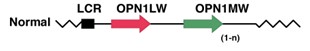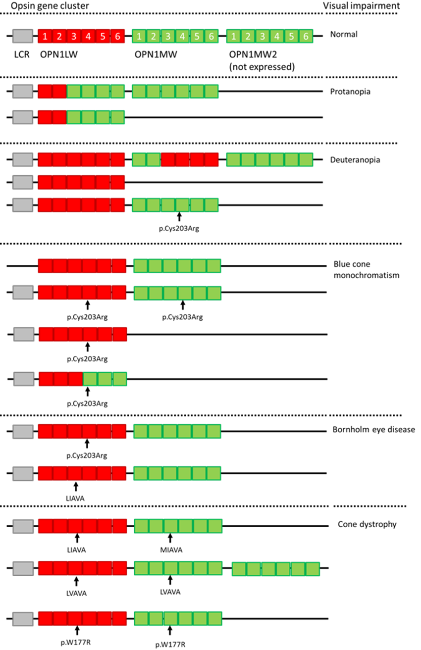Transcription of the OPN1LW and OPN1MW genes is regulated by a nearby region of DNA, known as the LCR (Figure 1). Only the two opsin pigment genes nearest the LCR, generally the OPN1LW gene and the first copy of the OPN1MW gene, are active in the retina and contribute to colour vision. Figure 2 gives an overview of the copy number changes and variants in OPN1LW and OPN1MW related to disease.