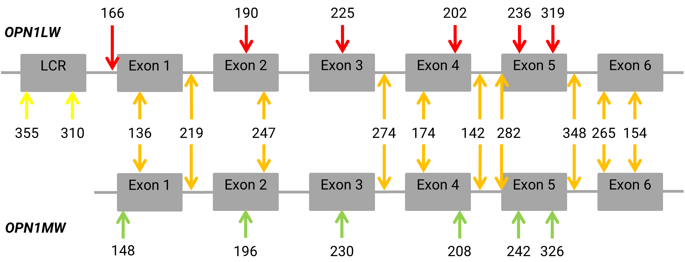 Figure 3. The location of probes targeting the genes OPN1LW (red) and OPN1MW (green) and the probes recognizing both genes (orange) and the LCR (yellow). The numbers above/below the arrows represent the length (in nt) of the respective probes. The 174 nt probe detects the wild-type sequence of the c.607T>C (p.Cys203Arg) mutation.
